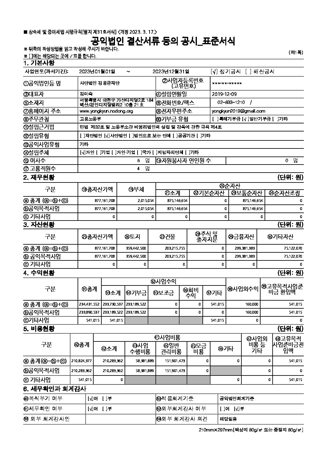 사단법인 김용균재단 2023년 공익법인 결산서류등의공시(표준서식)_홈페이지 게시용