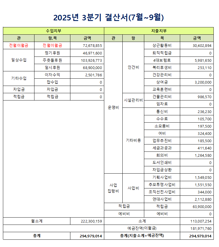 산재피해유족지원 목적기금으로 들어온 68,900,000원 중 2025년 하반기부터 2026년까지 500만원의 예산을 남기고 나머지 63,900,000원은 별도 기금 통장으로 적립해 두었습니다.